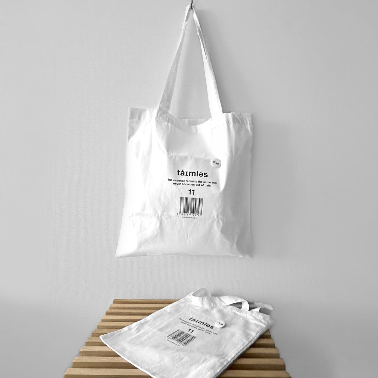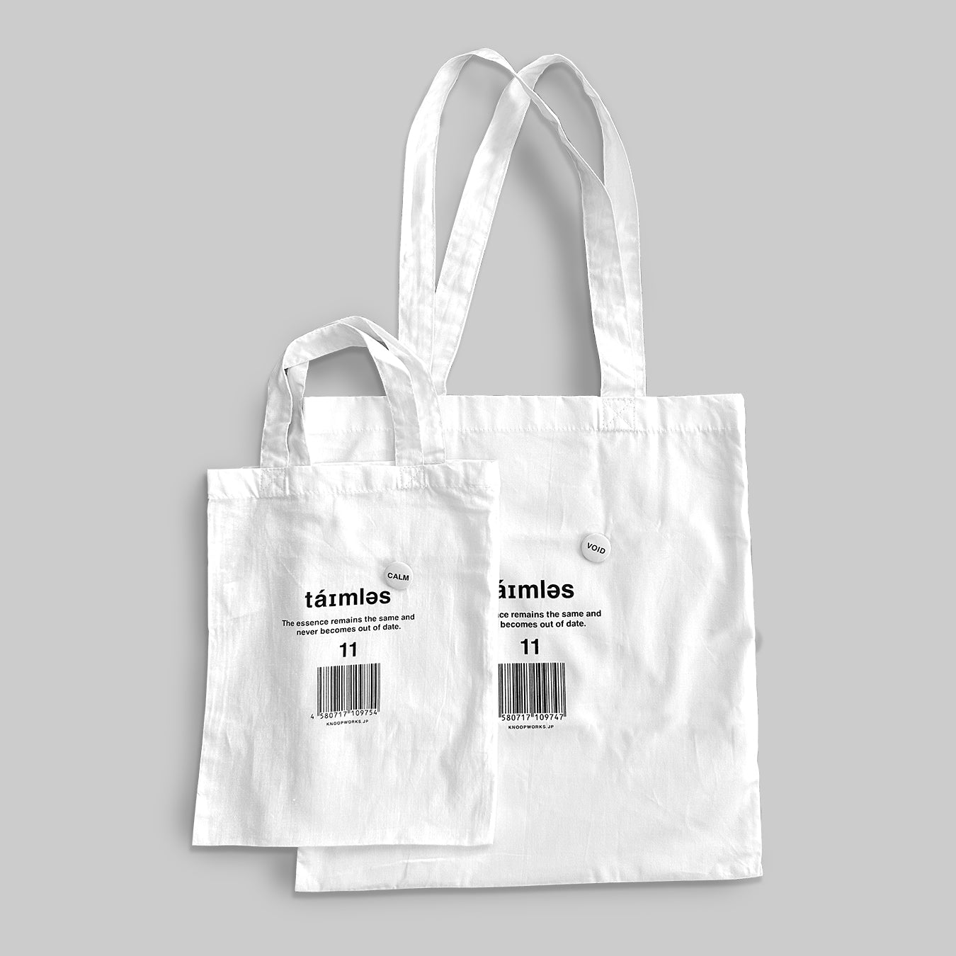 それぞれのトートには、「白」から着想を得た言葉「VOID」「CALM」の缶バッジ付き。バッグに付けてもアクセントです。
