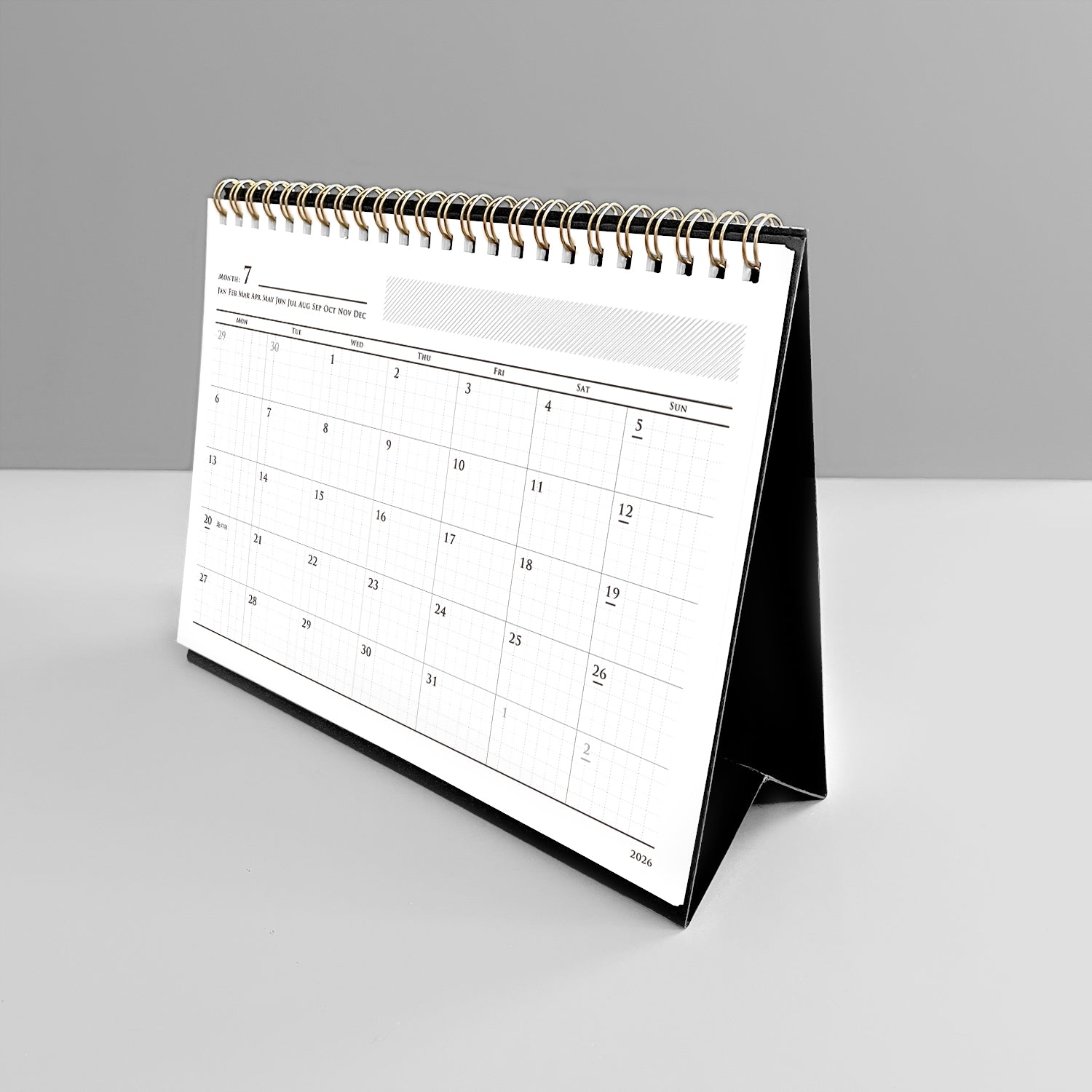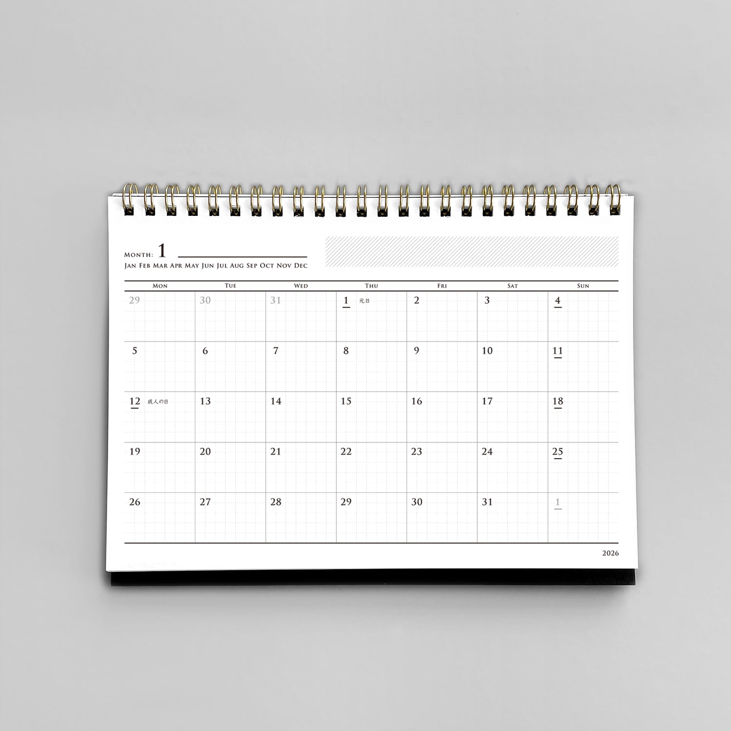 定番アイテムのB5プランナーのデザインを踏襲したシンプルデザインにゴールドのリングで仕上げました。日付は小さめに、コンパクトなA5サイズながらスケジュールを書き込めるスペースをできるだけ広くとりました。